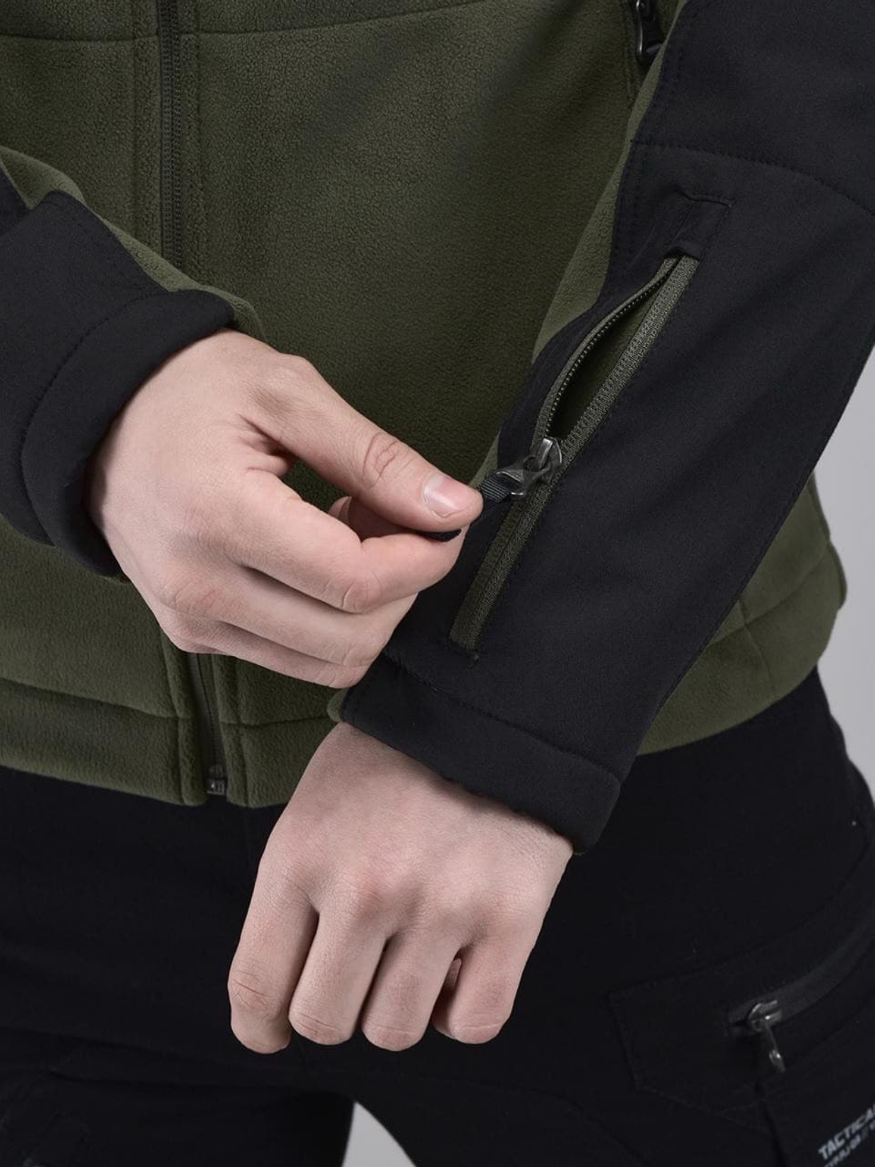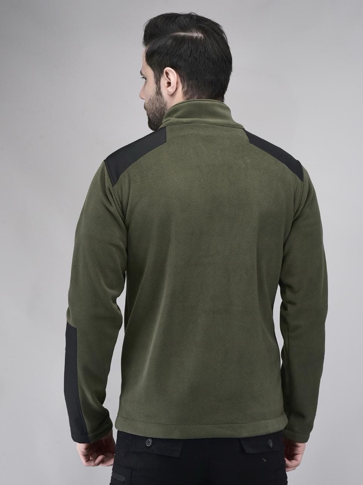 The rich olive green body paired with black reinforced panels on the shoulders, sleeves, and chest enhances durability in high-wear areas while giving the jacket a bold tactical edge. The soft fleece interior traps body heat efficiently without adding bulk, making it ideal for long hours of wear.