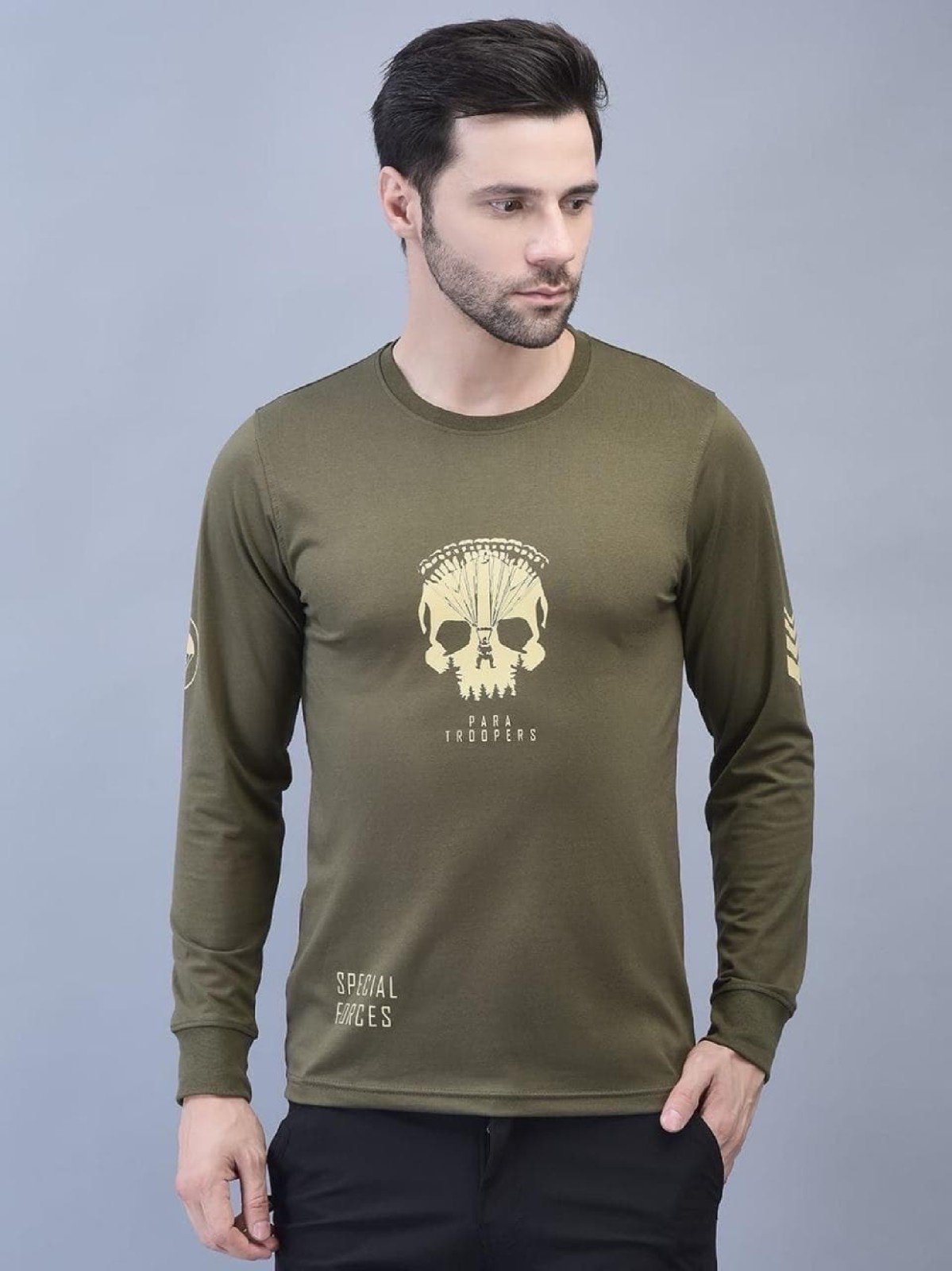Green Cotton Lycra Full Sleeves Tee With Skull Para Trooper Logo